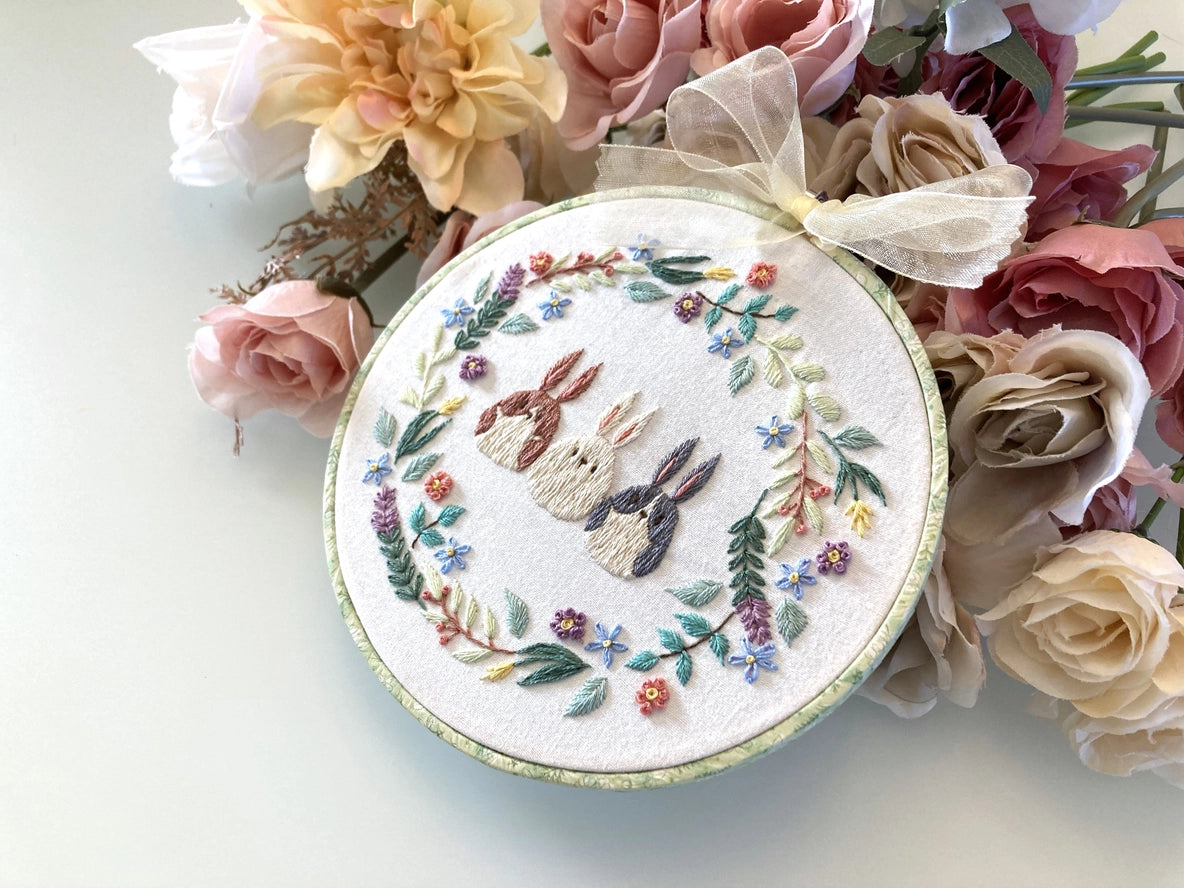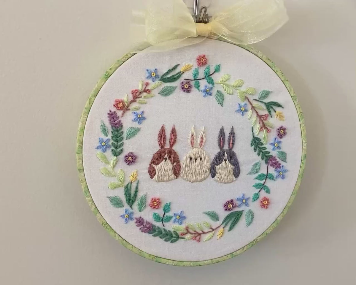 Wooden embroidery hoop, fabric, DMC floss, needle