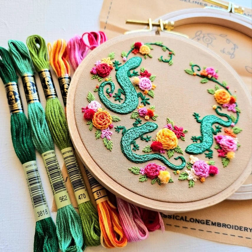 Do you love to embroider with bright colors and fun textures? This fun project features a trio of geckos surrounded by colorful, dimensional florals.