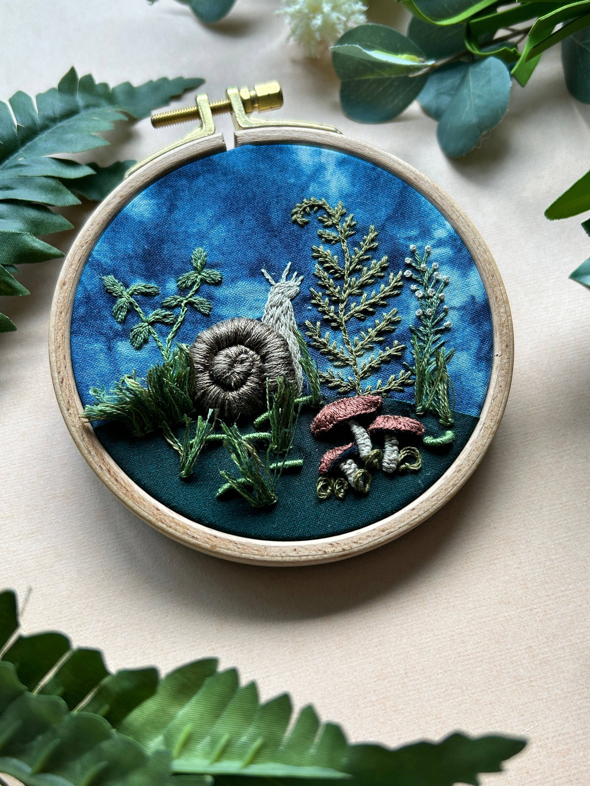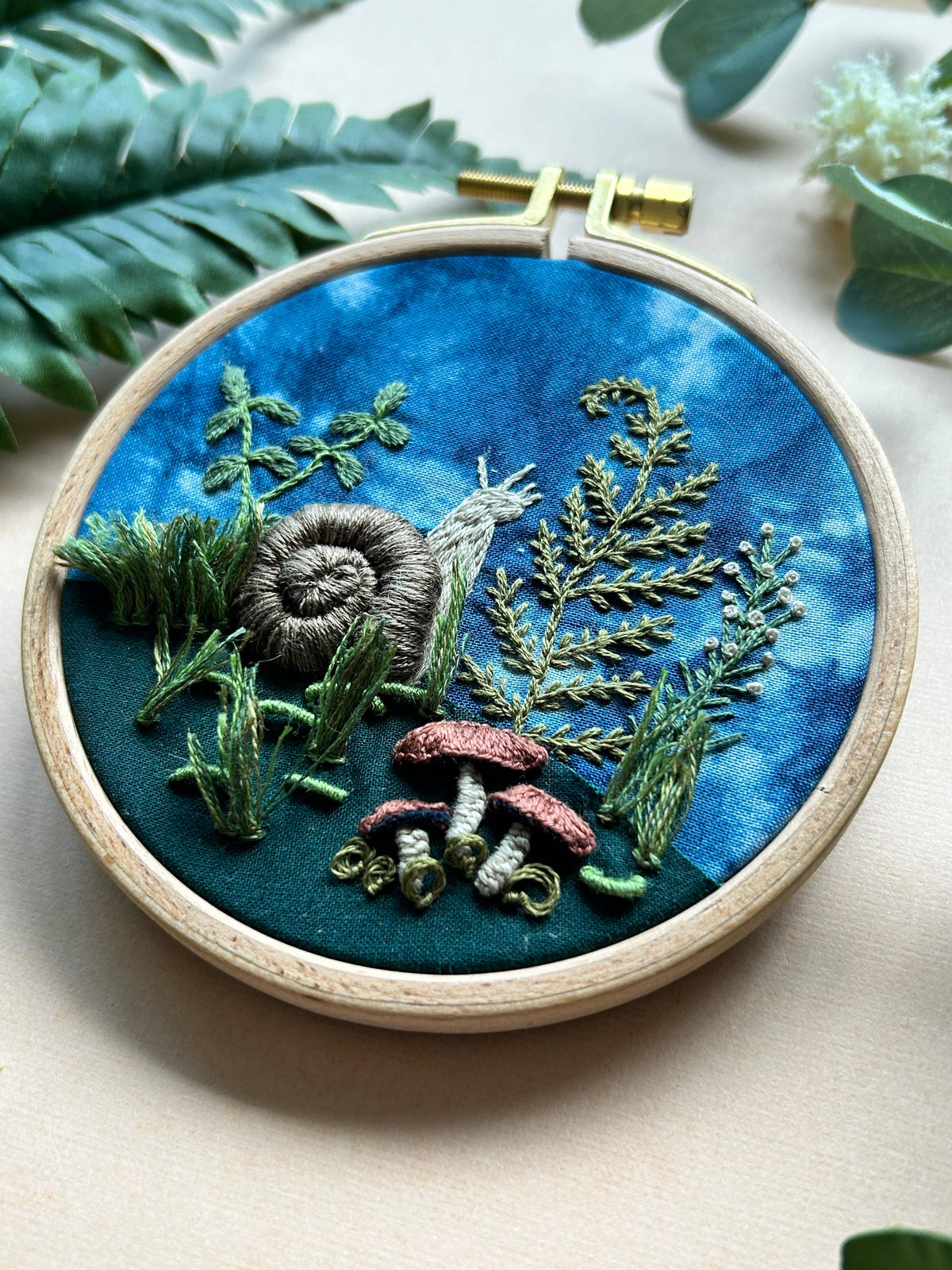Create a three-dimensional snail among plants with our advanced embroidery kit. Full of lush plant life, this DIY hand embroidery kit features a fabric applique ground surrounded by textural plants, 3D mushrooms, and more.